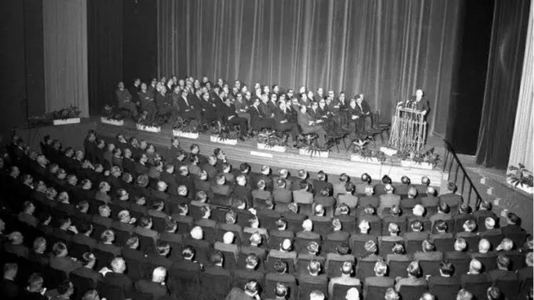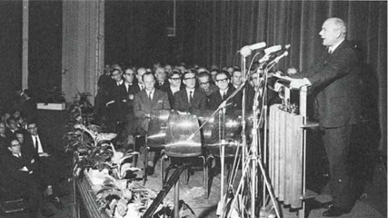 Aankondiging van de sluiting van de mijnen door Joop den Uyl in de Schouwburg van Heerlen