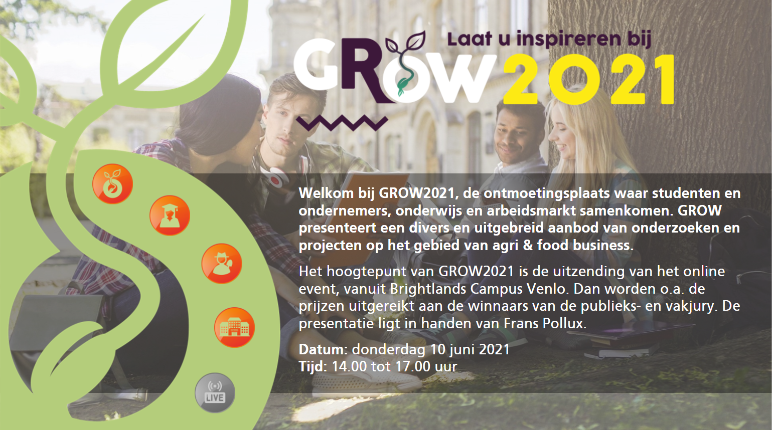 We nodigen je graag uit voor een nieuwe editie van GROW op donderdag 10 juni (van 14.00 tot 17.00 uur). De opzet is dit jaar anders in verband met corona, maar voldoet evengoed aan het uitgangspunt van GROW: Het is en blijft dé ontmoetingsplaats waar onderwijs en arbeidsmarkt samenkomen. In een marktsetting presenteren studenten hun projecten aan ondernemers.