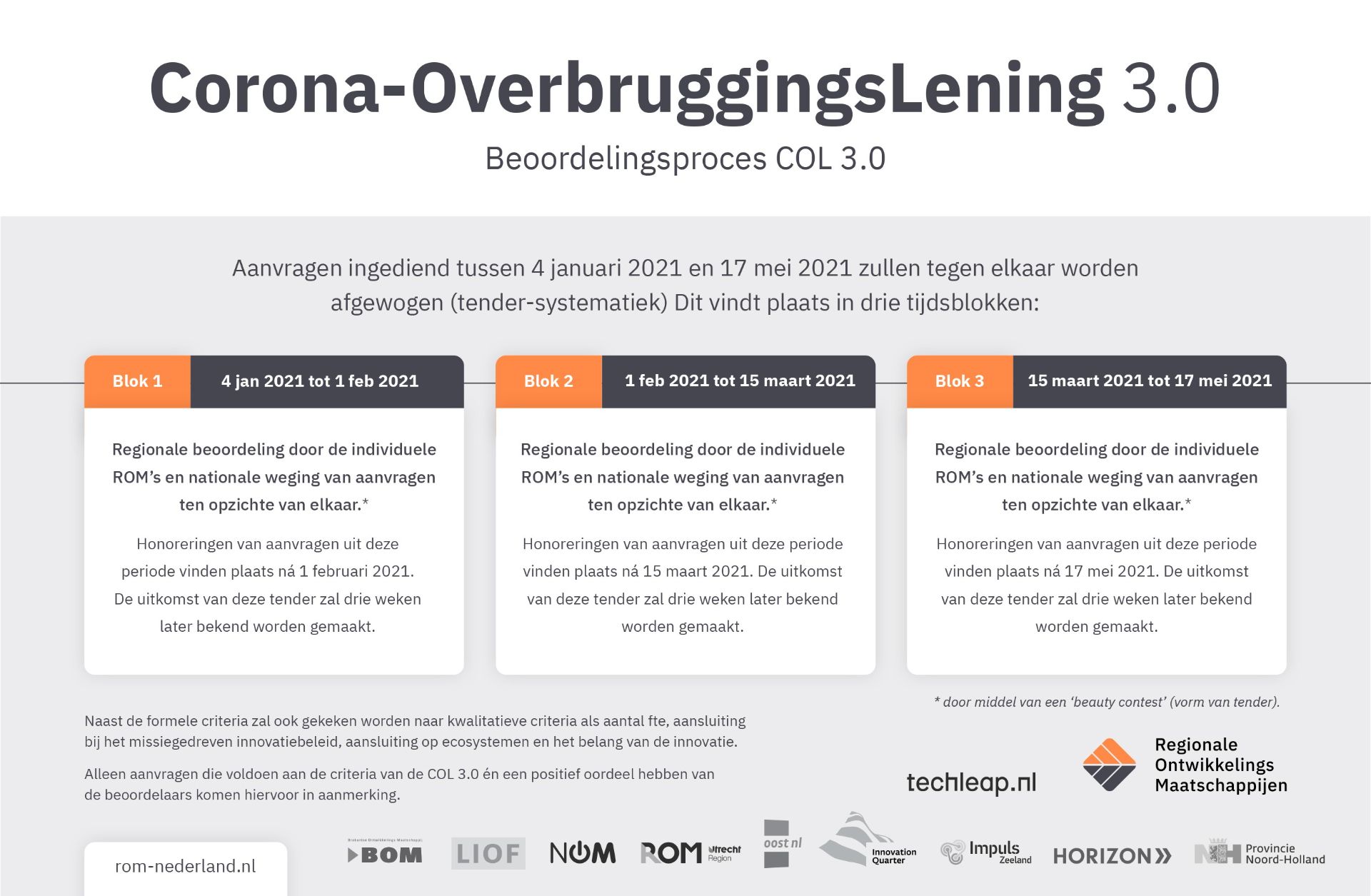 De Corona-OverbruggingsLening (COL) is een noodkrediet voor innovatieve ondernemers en mkb-ers zonder bancaire kredietrelatie die in financiële problemen zijn gekomen door Covid19. In totaal is er €300 miljoen beschikbaar gesteld door het Ministerie van Economische Zaken en Klimaat (EZK). Op verzoek van EZK verstrekken de regionale ontwikkelingsmaatschappijen (ROM’s) overbruggingsleningen tussen de €50.000,- en €2 miljoen onder gunstige condities.