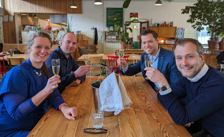 Embrosa en LIOF toosten op de samenwerking. V.l.n.r. Melanie van Norden (Embrosa), Ralf Hendriks (LIOF), Ralph Hunnekens (LIOF) en Rogier van den Berg (Embrosa).